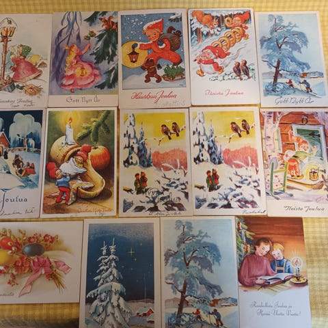 Joulu on jo takana, mutta tässä on vielä vanhoja kortteja, jopa yli sadan vuoden takaa. Kortit maksavat 1 euron kappale. Postikulut kirjeessä on 2,75 euroa 50 grammaan asti ja sen jälkeen 5,50 euroa.