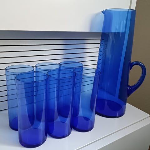 Kumelan lasinen vaasi ja tarjoiluastia. Vaasi 18cm korkea ja täysin ehjä. Tarjoiluastia 27cm leveä ja reunassa kolhuja.