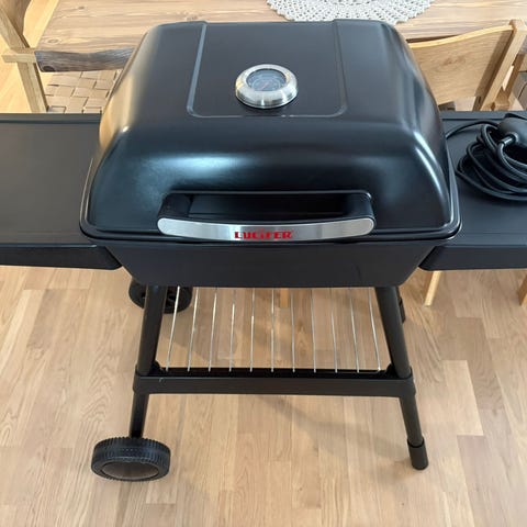 Klarstein sähkögrilli, jossa on musta kansi ja punainen kahva. Grillissä on kaksi sivutasoa ja alahylly, sekä pyörät helpottamaan liikuttelua.Grillin muotoilu on moderni ja käytännöllinen, sopien hyvin erilaisiin ulkotiloihin. Klarstein on tunnettu merkki, joka yhdistää tyylin ja toiminnallisuuden.Grilli näyttää käyttämättömältä, hieman pintalikaa ja varastointi pölyä.