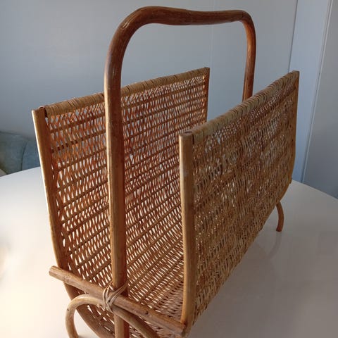 Vintage-lehtiteline, joka on valmistettu rottingista. Tämä teline on suunniteltu pitämään lehdet ja aikakauslehdet järjestyksessä ja helposti saatavilla.Telineessä on näkyvissä jonkin verran kulumaa ja patinaa, mikä on tyypillistä tämän ikäiselle esineelle. Rottinki on säilynyt ehjänä, mutta pinnassa on pieniä naarmuja ja värimuutoksia. Yleiskunto on kuitenkin hyvä ja teline on edelleen täysin käyttökelpoinen.
