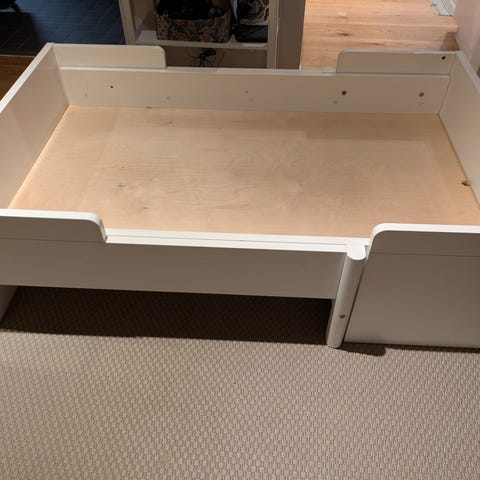 Joitain tarroja liimailtu. Helppo kasata puoli parveksi tai voi pitää matalana sänkynä.