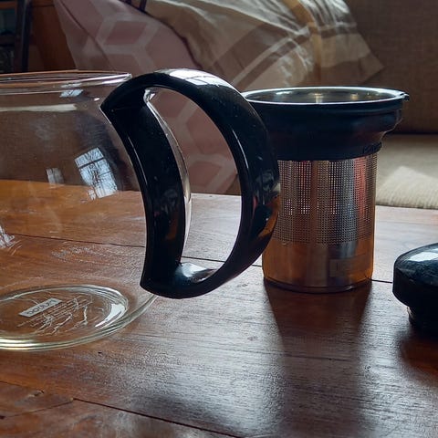 teekannu ja siivilä ruostumattomasta teräksestä ja lasista