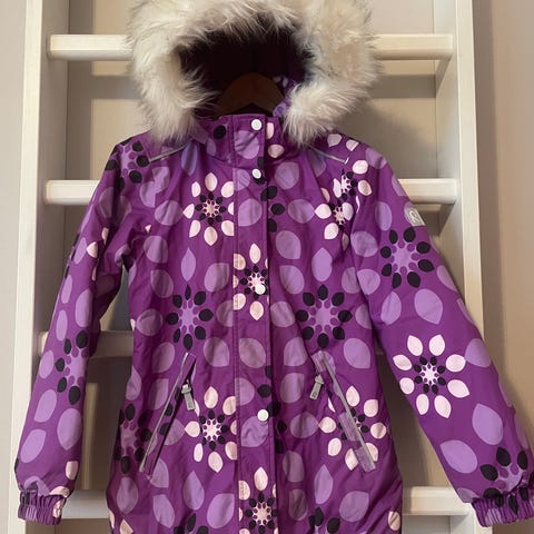 Pitkä lasten toppatakki, jossa kierrätysvanutäyte. Vettä ja likaa hylkivä materiaali. Irrotettava huppu ja tekoturkissomiste. Muotoonommeltu malli, lämmin ja helppohoitoinen.