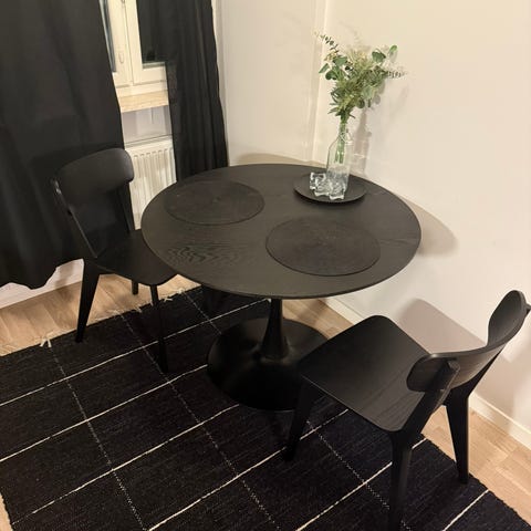 Kuvasta poiketen mukana tulee kolme tuolia.
