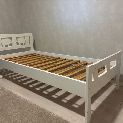 Sänky on ollu lastenhuoneeessa mutta siinä ei ole nukuttu kun muutamat päiväunet. Muutaman pienen kolhun löysin mutta muuten hyvässä kunnossa, vaatii ruuvien kiristyksen. Patja on uusi ja sen saa halutessaan mukaan.