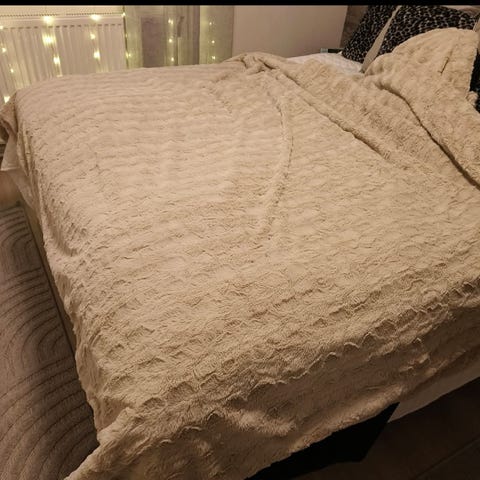 Vähän käytetty päiväpeite. Peitteessä on mustikka tahra, jota ei ole ollut aikaa puhdistaa.