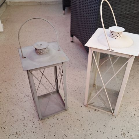 🩶Kaksi erikokoista koristelyhtyä sisätiloihin. Värinä tumman metalli. Ehjät ja hyväkuntoiset, olleet sisäkäytössä. Korkeampi lyhty noin 50cm korkea. Peilit leikattu lyhtyjen sisälle. Haku Kuopiosta.