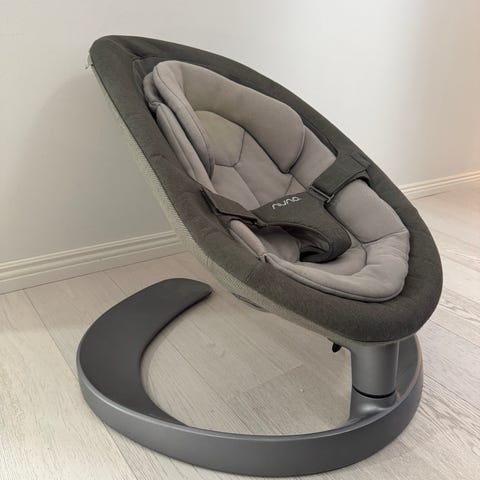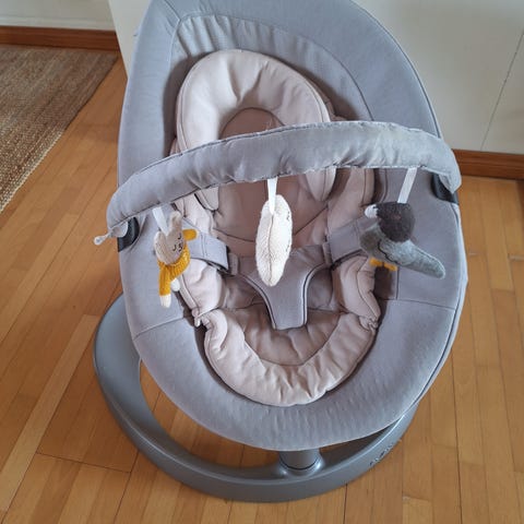 Myyntiin harmaa Nunan Leaf Grow sitteri. Keinuu hyvin ja kallistusmekanismit toimii moitteetta. Hyvässä kunnnossa. Hajusteeton pesu ollut käytössä kankaille.🩶
