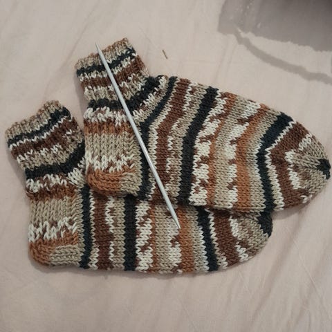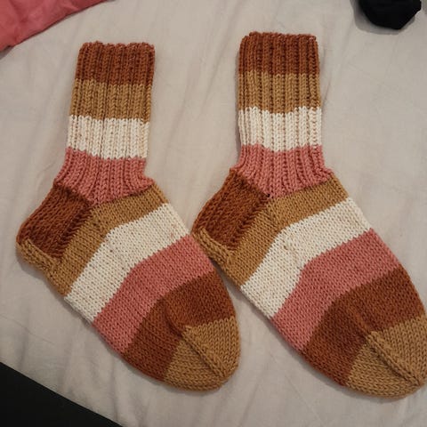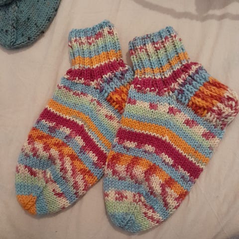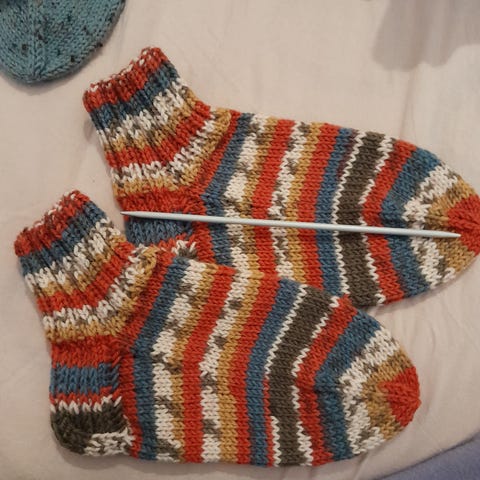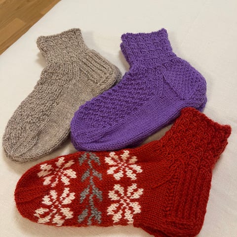 7 veljestä -langasta käsinneulotut villasukat. Eli 80% villaa ja loput polyesteriä. Koko noin 37 (villasukat joustaa, joten ehkä +-1 kengännumero).