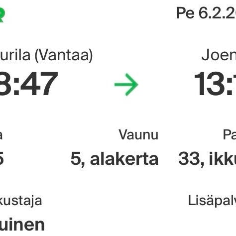 VR IC-junalippu Joensuu Tikkurila 8.2.