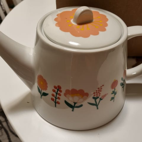 Teekannu ja sokerikko, sekä kermakko ja sokerikko.