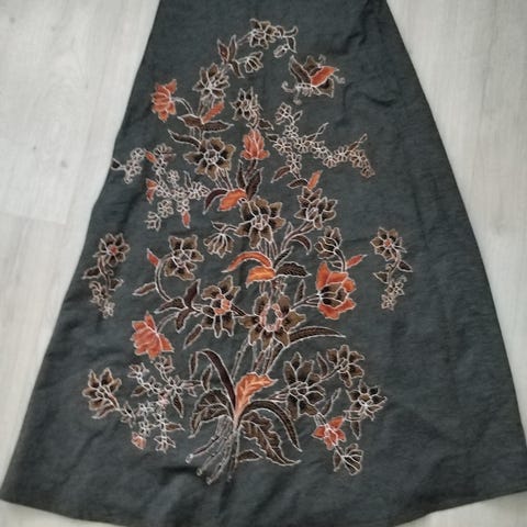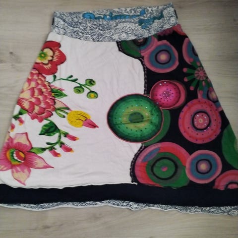 Smash! Merkkinen kirjava tunika. Hihat mustat. Etu-ja takakappaleeseen kuvattu puita ym. Ohkanen. Vyötäröllä jousto-ommel kaistale. Koko lapun mukaan L, mutta menee mielestäni M - kokoiselle. Erinomainen kunto.