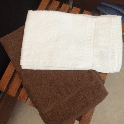 Mique Magic Towel 30x50 cm, Softcare froteeliina 30x30cm. Yhteensä 3 €.