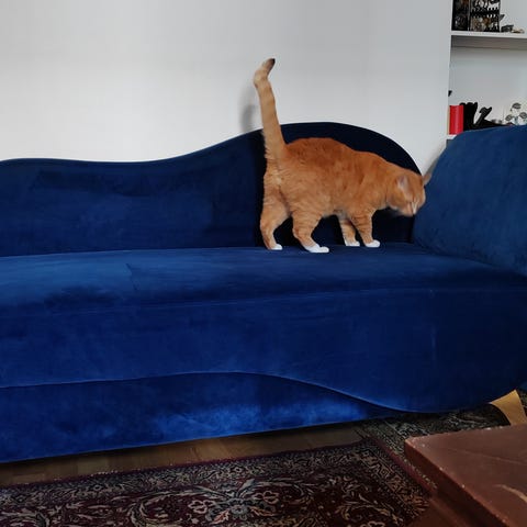 Kissakoti. Ei kynnenjälkiä, ei pahemmin karvojakaan, koska olen pitänyt päiväpeittoa suojana. Nyt tuote-esittelijä pääsi kuvauksen aikana hetkeksi sohvalle.