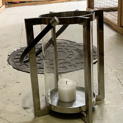 Esprit isompi sateenvarjo, kävelysauvat ja isohko kukkaruukku.