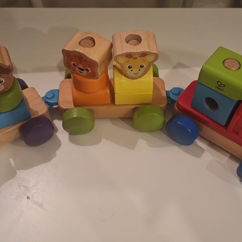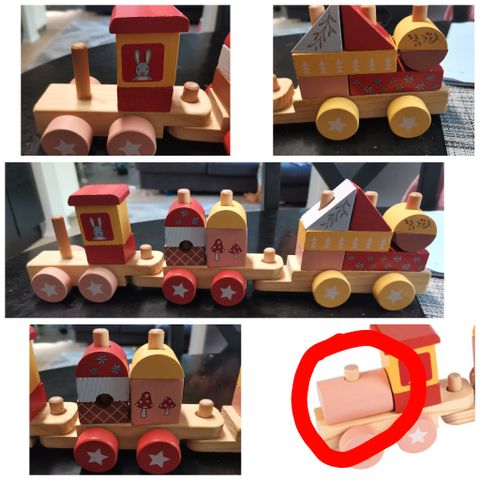Ihana puinen palikkajuna, käytön jälkeä jonkun verran, mutta yleisilmeeltään siisti.