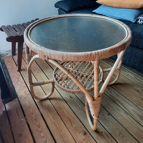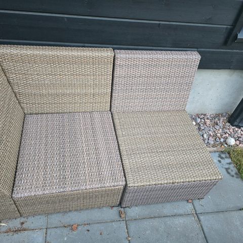 Rottinki kulmasohva harmailla pehmusteilla. Sopii ulkokäyttöön tai terassille. Sisältää sohvan ja irrotettavat pehmusteet. Mukana rahi/sohvapöytä.