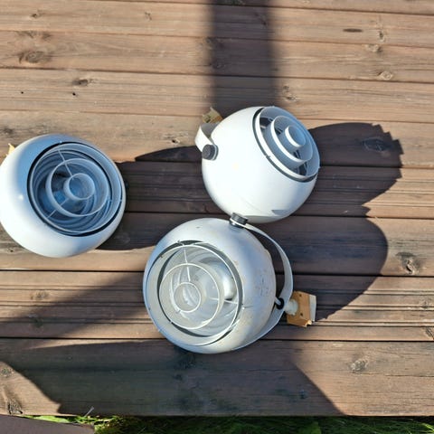 Heikki Turusen 70-luvulla suunnittelemat ja Ornon valmistamat kattovalaisimet, joissa punaiset ”spotit” ja valkoiset varret magneetti-kiinnityksellä. Valaisimet ovat ehjät ja hyväkuntoset (joitakin ohuita ja aivan pieniä naarmuja tullut ajan saatossa). Voidaan käyttää ryhmänä tai yksittäin. Yhden pallon koko n. 21x21 cm ja varren pituus 28,5 cm.