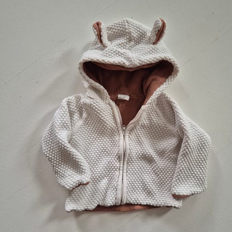 Beige puuvillainen neuletakki vauvalle. Kokomerkintä 62, mutta malliltaan väljä ja mahtui meillä vielä koossa 74. Siisti, käytetty kunto. Parista kohtaa törröttää langanpää, muttei näyttäisi purkautuvan.