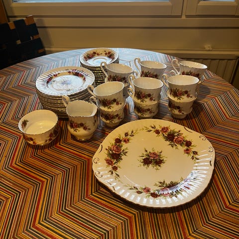 Englantilainen Rose Bouquet, Royal Victoria kahvi astiasto. Kaikkia kuusi kappaletta. Kupin vetoisuus 2 dl, ajastin halkaisija 14,5 cm ja pulla lautasen halkaisija 17 cm. Astiat ovat hyväkuntoiset ja ehjät. Voin postittaa, postitusmaksu on 10 euroa.