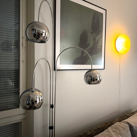 Myydään näyttävä vintage-kaarivalaisin krominvärisillä lampunpäillä. Valaisin on hyväkuntoinen ja täysin toimiva.
