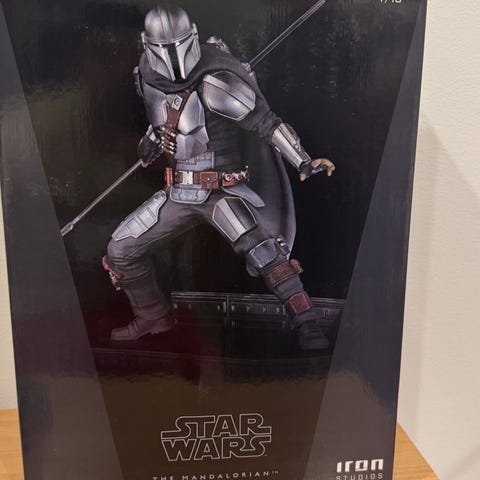 Iron Studios Star Wars The Mandalorian and Grogu figuuri, 1/10 mittakaavassa. Figuuri esittää hahmoja Mandalorilainen ja Grogu, mukana tukeva jalusta.