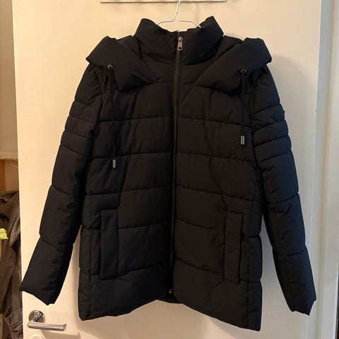 Todella lämmin ja muhkea, polvipituinen, hupullinen talvitakki. Pituus n.90 cm. Thinsulate täytteinen, joten sopii allergikoillekin.