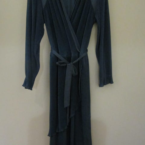 Nyt uniikki kauniisti laskeutuva joustavasta keinomateriaalista ommeltu mekko. Oliskohan polyester ja elastaani?Tuntuu käteen siltä. Kokonaisuuden mitta olalta helmaan 142 cm. Rinnan ympärys 98 cm. Hiha 42 cm. Lantio 104 cm. Rinnan alta laskoksen kohdalta 87 cm vaatteen päältä mitattuna. Vetoketjun yläpuolella olevan koukun voi kiinnittää kankaaseen suoraan tai vaihtaa siihen metallikoukun. Ihanan kirkas vihreä väri. Uniikki. Kävisikö sinun mittoihin?