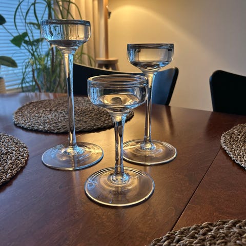 Myydään kauniita Ikean lasisia kynttilänjalkoja- 34 kpl. Vain kerran käytetty. Täydelliset vaikka romanttisen ystävänpäivän iltaan.