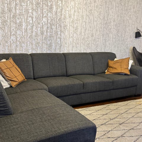Sohvan pitkä sivu 264cm, lyhyempi 204cm ja syvyys 89cm. Istuinkorkeus n. 45cm ja sohvan syvyys 89cm. Kokonaiskorkeus n. 78cm ja tammijalkojen korkeus 15cm. Sohvan saa helposti purettua kolmeen osaan, mutta kätisyyttä ei voi vaihtaa.