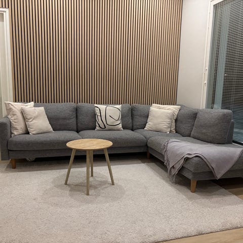 Istuin- ja selkänojatyynyissä irrotettavat päälliset, jotka voi pestä varovaisella pesulla koneessa. Muotoilu kosteana paikoilleen. Muutoin kiinteät verhoilut. Myös tausta verhoiltu, joten mahdollistaa sijoittamisen myös keskemmälle huonetta.