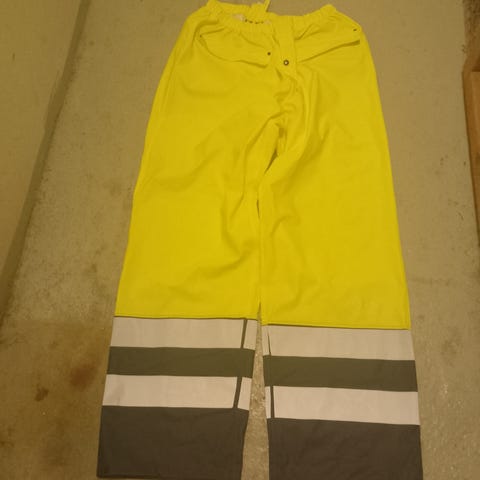 Sadehousut keltainen, koko xxl (192+ cm.), mat. pvc 70 %/ polyester 30%, napakkaa eli kunnollista, resori ja nepit lahkeensuissa. Kunto K3 (1-5) Vähän käytetty, pientä värjäymää tms. Ei valmistajaa, kiina?