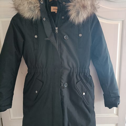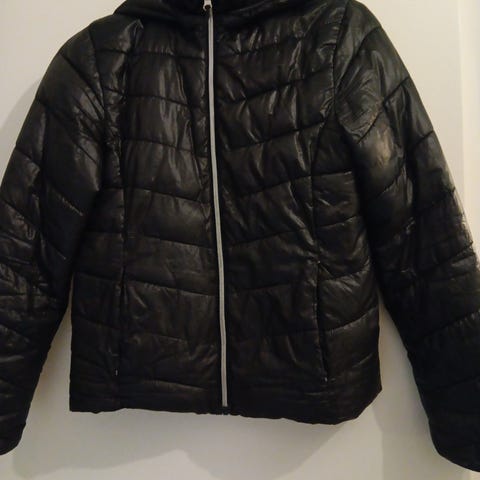 Vuorellinen takki, tikattua kangasta. Pystykaulus ja irrotettava huppu.