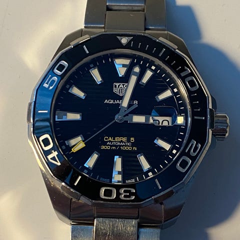 Tarjolle huippukunnossa oleva Aquaracer Solargraph. Selkeälukuisella mustalla taululla jossa päivyri sekä loistavan lumen omaavat osoittimet ja indeksi unohtamatta näyttävyyttä lisäävää turkoosin väristä sekuntiosoitinta. DLC pinnoitettu musta teräksinen kuori jossa teräs/hiilikuitu DLC/Super-Luminoiva ajanottokehä jossa upea lume. Rannekkeena täyspitkä pätkimätön musta kumi DLC pinnoitetulla taittolukolla varusteltuna. Mukaan lisäksi vielä muoveissa olevat uudet kumit sekä uusi taittolukko jotka kelloon erikseen ostettu (370e). Koneistona toimii TAG Heuerin ensimmäinen Solargraph moduuli Cal. TH05-00 joka latautuu keinovalosta sekä auringonvalosta. Täys setti ostokuitteja myöden. Kellon takuukortti on aktivoitu 6/2023. Ovh. 3 550e.