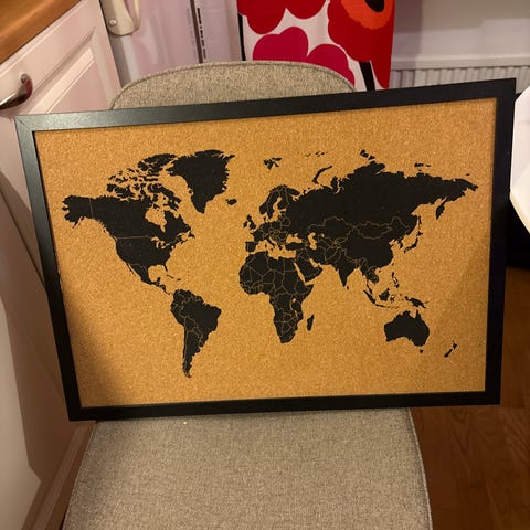 Vanha mutta kunnoltaan kuin uusi maailman karttataulu. Suojamuovi vielä päällä. Takana kiinnitykseen "rautalankaviritys".
