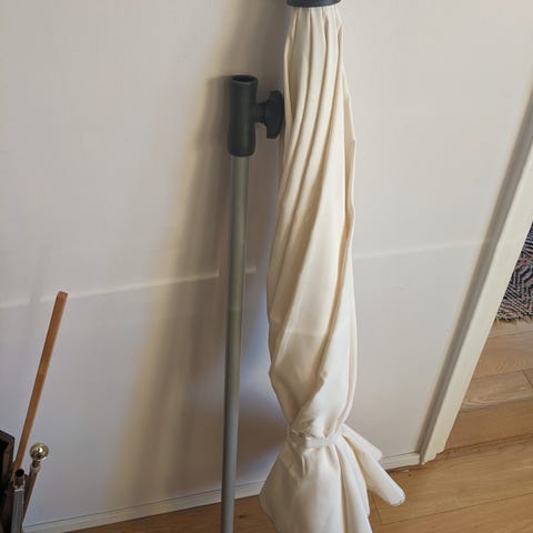 Aurinkovarjo, halkaisija 3m, aukaistaan veivillä, lisäksi kallistusmekanismi. Painava kivimäinen jalusta. Ehjä ja toimiva kokonaisuus pois muuton vuoksi. Nouto Oulunkylästä.