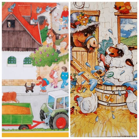 Ravensburger 100 palapeli, jossa on maatilamaisema-aiheinen kuva.