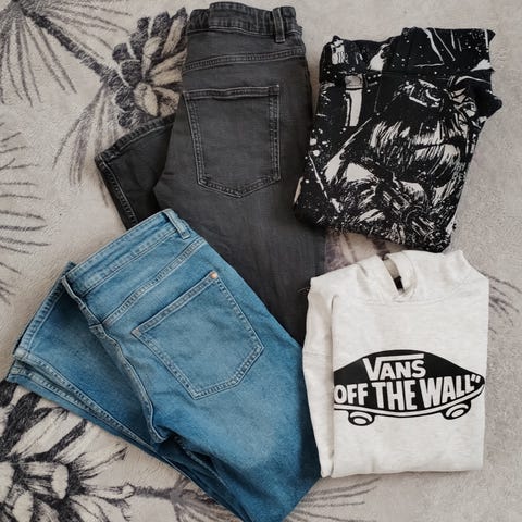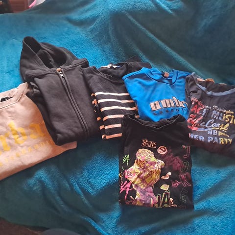 Siisti vaatepaketti, muitakin kokoja seassa mutta olleet tuossa kokohaarukassa käytössä. Neljä hupparia, kaksi pitkähihaista paitaa, kolme t-paitaa, tekninen kerrasto, yhdet farkut, kahdet collegehousut ja kahdet shortsit.