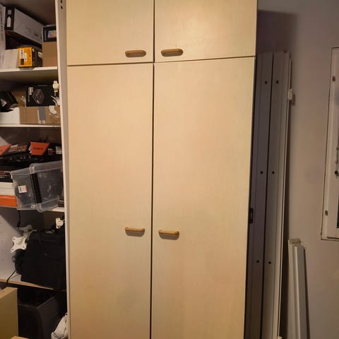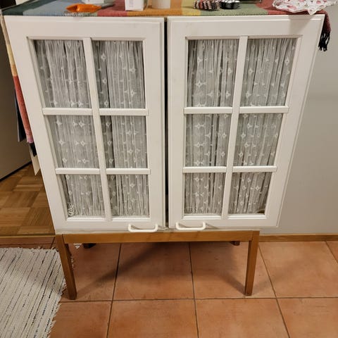 Pieni vanha kaappi, jonka voi sijoittaa lattialle tai pöydälle. Käytännöllinen, mutta vaatii maalia jos ulkonäkö merkitsee. Toimii myös pöytänä tai laskutilana.