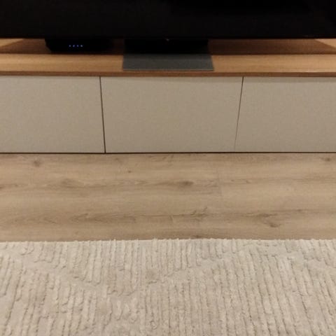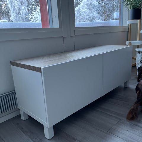 Ikea Bestå TV-taso, valkoinen, 180cm, päällä lasilevy ”maitolasi”