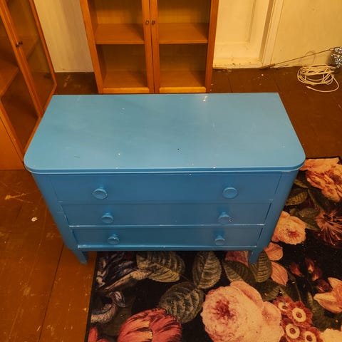 Uuteen kotiin puinen lipasto. Tässä käsittääkseni alunperin ollut päällä jokin peiliosa tms.