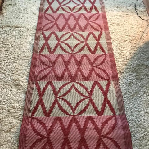 Musta harmaan värinen matto jossa riikinkukon kuvio.