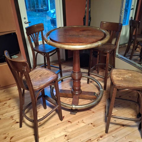 Hyvä kuntoiset tuolit ja ok kuntoinen baaripöytä! Pöytä vähän hutera mutta ei kuitenkaan niin että kaatuaisi! Nouto Orimattilasta.