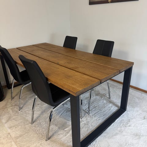 Pöytä on jatkettava: pituus 180-270cm (kaksi jatkopalaa á 45cm), leveys 120cm, korkeus 76cm.