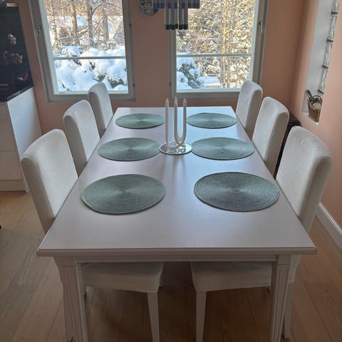 Jatkettava ruokapöytä ja 8 tuolia, Selva