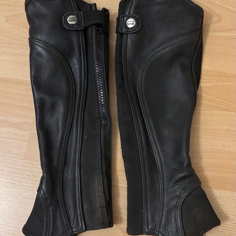 Nahkaiset mustat chapsit. Mallissa on vetoketjut sivuilla sekä joustavat paneelit, jotka helpottavat pukemista ja istuvuuden säätöä. Alareunassa on lenkit, joilla varet kiinnittyvät kenkiin. Koko 14 vuotta.