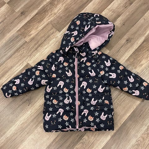 GAP Baby toppatakki tytöille, koko 98. Väri vaaleanpunainen. Takissa on toppaus ja lämmin vuori, joka näyttää fleecevuorelle. Edessä vetoketju ja painonapit. Hupullinen malli. Sopii arkeen ja ulkoiluun viileämmällä säällä.