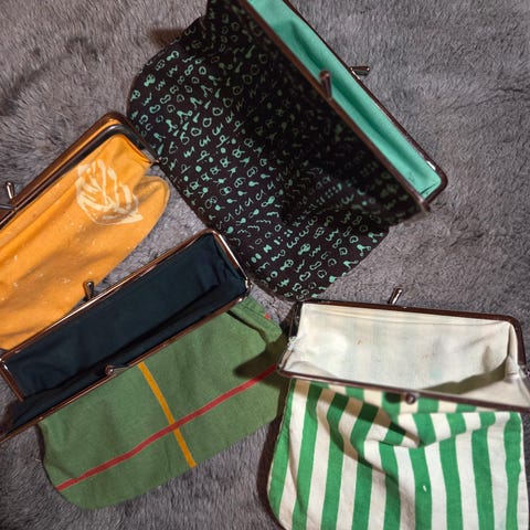 Itse tehty isohko pussukka. Päällinen Marimekon Jokapoika-kangasta. Vuorissa pankkikortin kokoinen lokero.