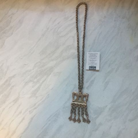 Patinoitunut kaulakoru Kalevalalta. Ketjun pituus 60cm. Pronssia. Riipus n.7x8cm.