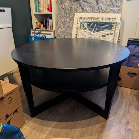Vähäisellä käytöllä ollut pöytä.Ei käytön jälkiäHalkaisija 80cm,korkeus 45cm